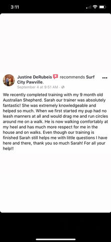Sarah N is just loved by my dog. She is really intuitive about my dogs behavior and how to do immediate corrections without intimidation. She has an uncanny way of connecting with all animals which certainly attests to the fact that she is truly an animal lover.